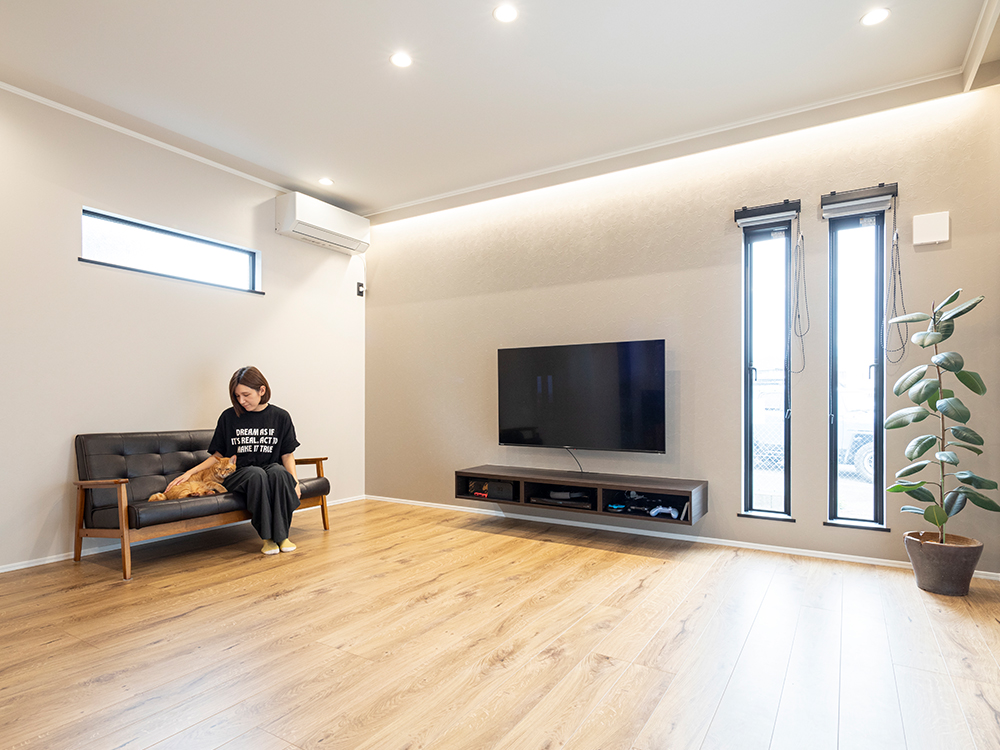 のびのびとした広さにこだわったLDKは、どこにいても家族の気配を感じられる一体感のある設計に。ナチュラルで落ち着きのあるインテリアが、居心地のいい雰囲気をつくり出している。
